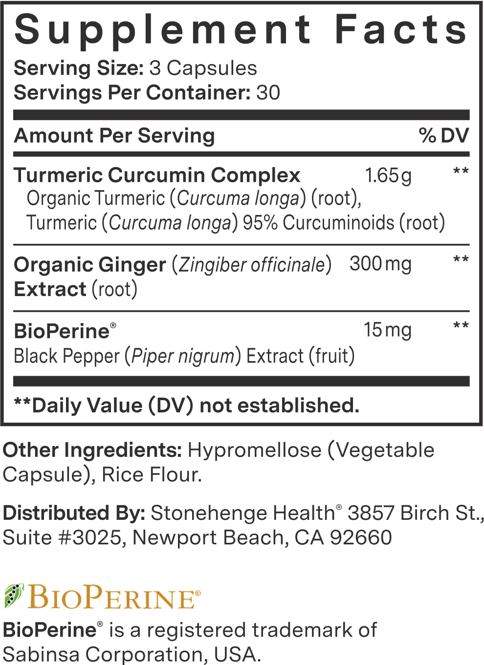 Stonehenge Health’s Dynamic Turmeric formulated with BioPerine® can ease your joint discomfort while boosting digestive health and overall wellbeing. It’s a powerful blend of 1,650 mg Organic Turmeric Curcumin Complex with 300 mg Organic Ginger Root Extract and BioPerine® that increases the absorption rate by up to 2000%.