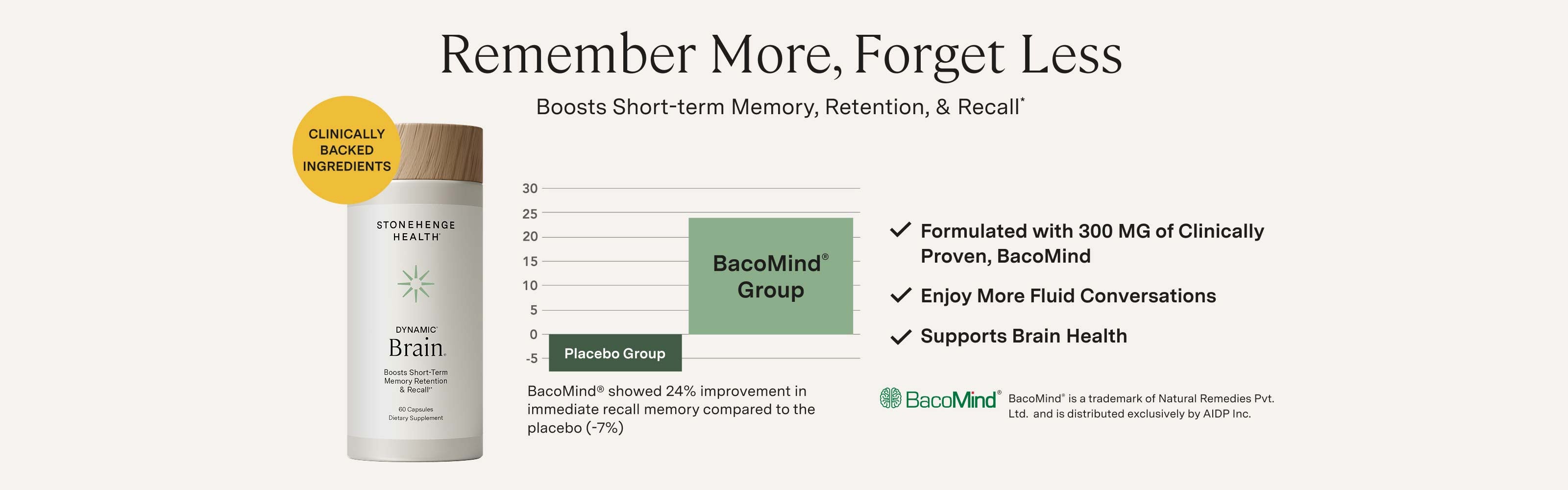 With Dynamic Brain you can boost your brain health and maximize your brain's memory with a cognitive-enhancing formula powered by one of the best-studied nootropic herbs available, BacoMind® Bacopa monnieri.